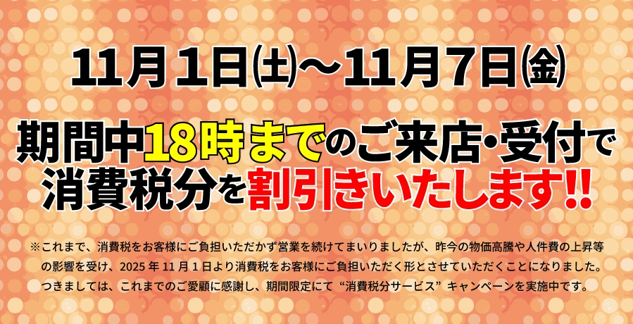 昨今の物価高騰や人件費の上昇などの影響を受け、2025年11月1日より消費税をお客様にご負担いただく形とさせていただくことになりました。